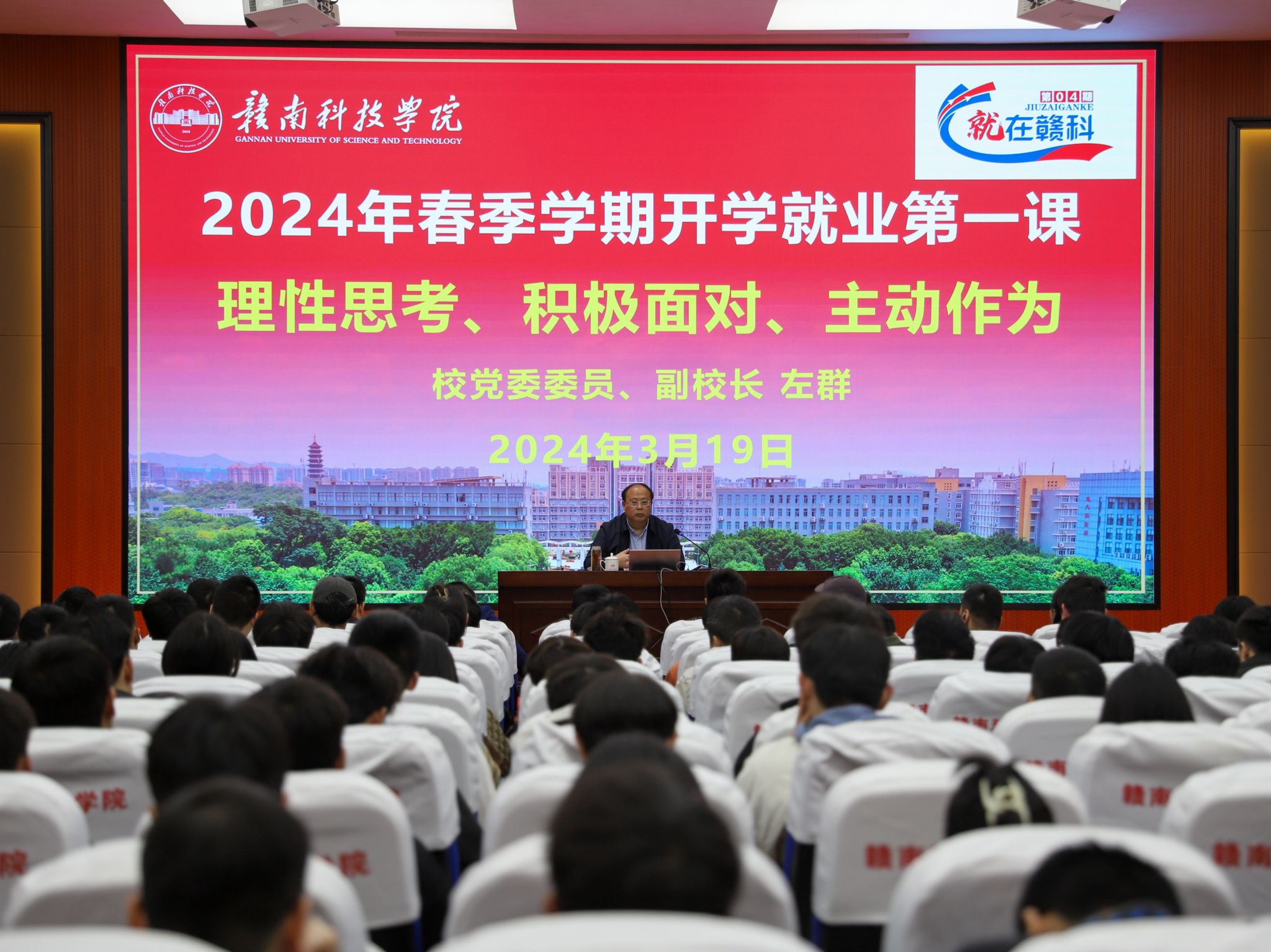 本次讲座以“理性思考  积极面对  主动作为”为主题,讲座内容主要分为:目前大学生的就业现状、毕业生求职就业若干政策、赣科学子担当作为等三个方面。