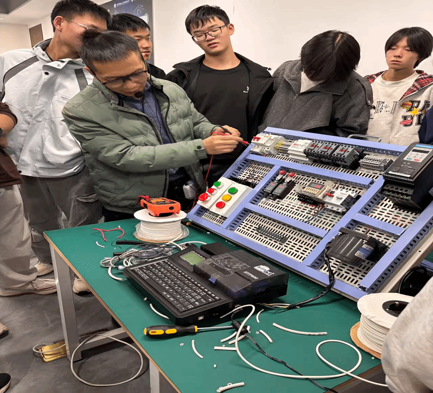活动伊始,师生们便在高起点上开启了实践学习——他们来到了资深技术专家张小平的工作室。这里不仅是技术攻坚的阵地,更成为了现场教学的课堂。张老师以自身主导的自动化项目为案例,将智能制造的技术流程与工程思维具象化、透明化。他的讲解深入浅出,让同学们得以零距离接触行业一线的真实挑战与解决方案,收获了超越书本的宝贵知识。