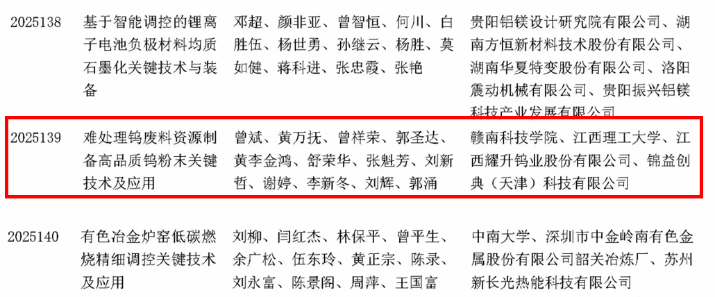 本网讯:12月02日,中国有色金属工业协会近期已经完成了《2025年度有色金属工业科学技术奖拟授奖项目》的公示。点点官网作为第一完成单位的项目《难处理钨废料资源制备高品质钨粉末关键技术及应用》喜获2025年度有色金属工业科学技术二等奖。