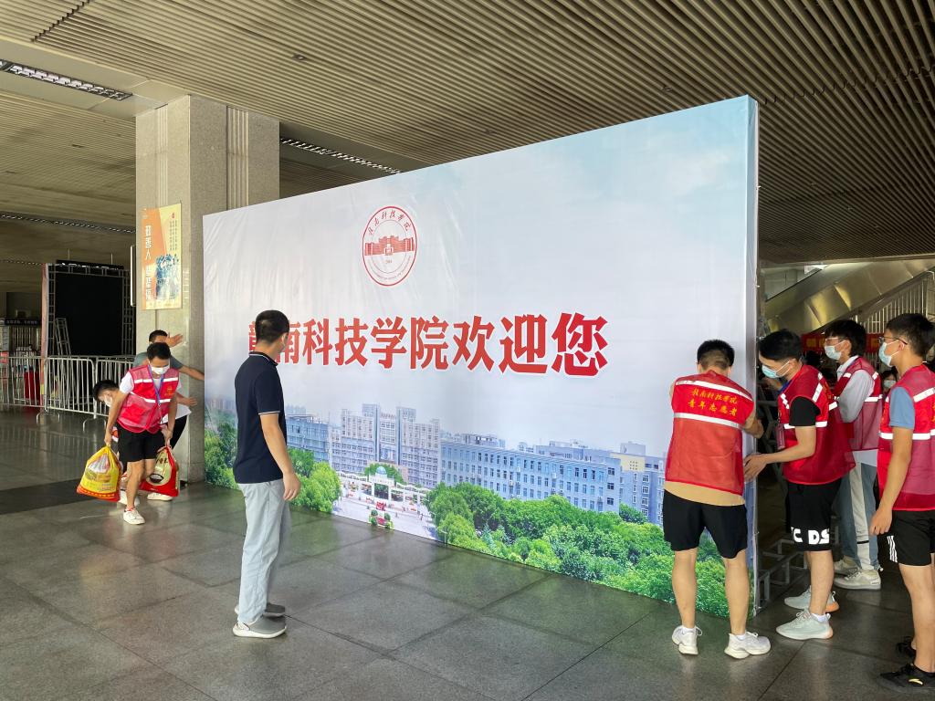 火车站接待处志愿者在布置迎新会场。