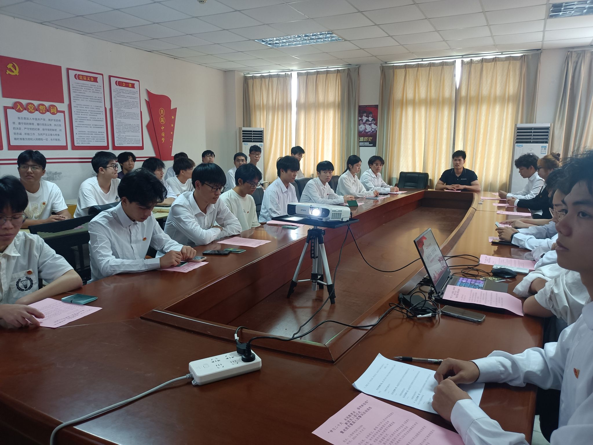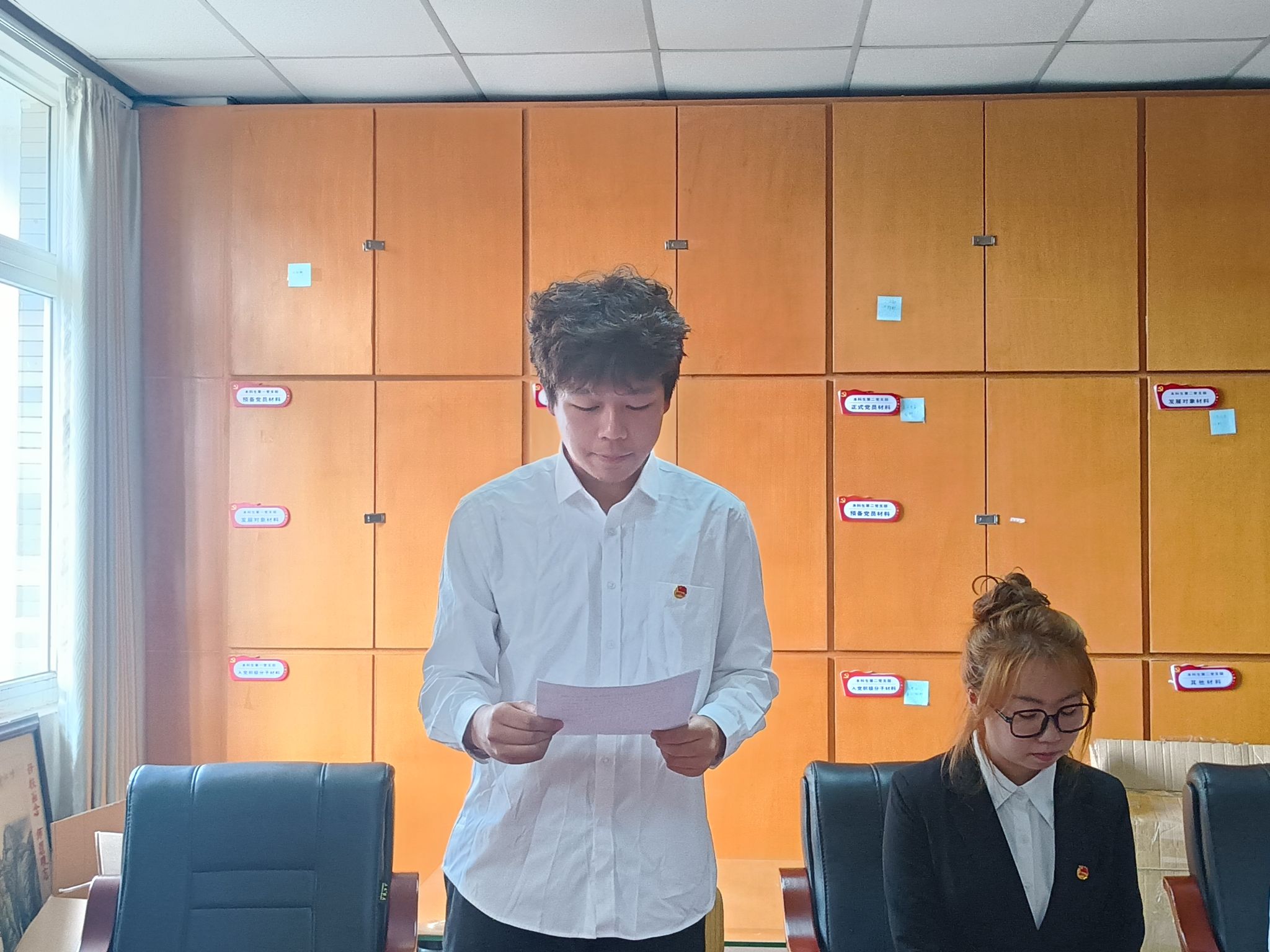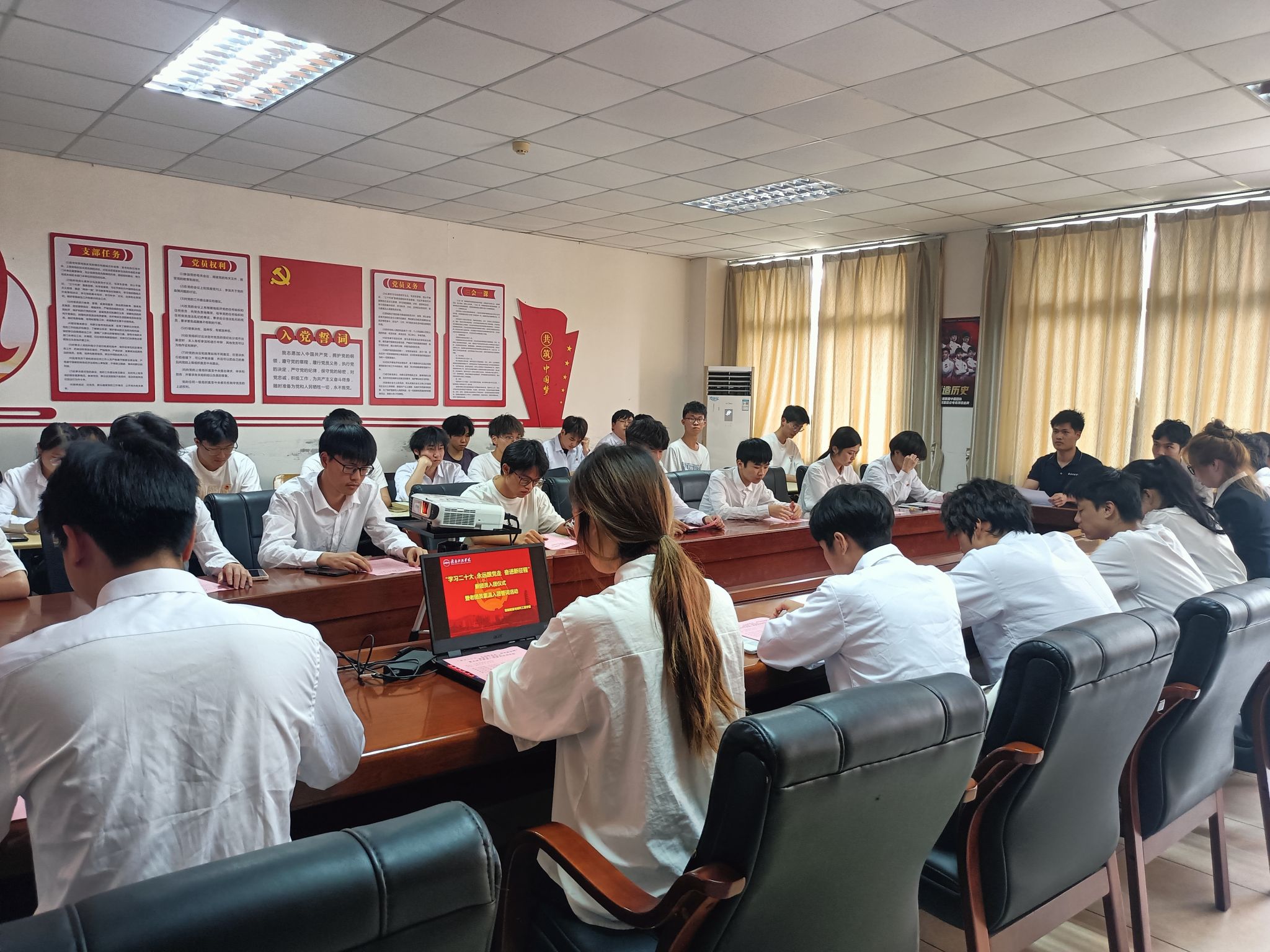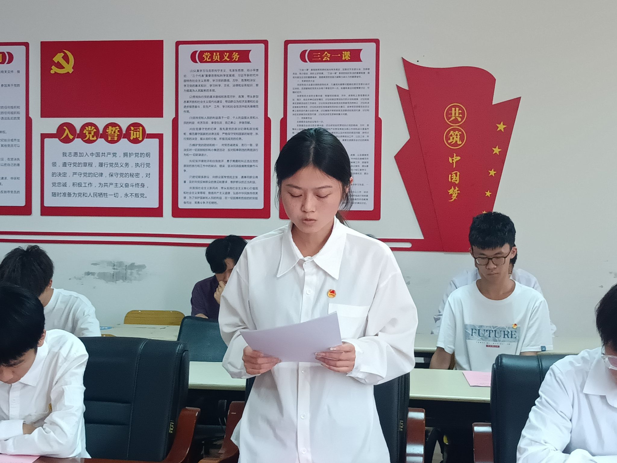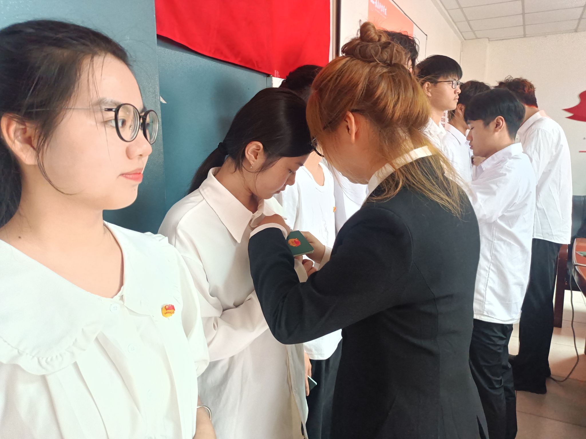 会议伊始,钟冬萍同学宣读了新团员名单,老团员代表亲手为新团员们佩戴了团徽,象征着他们正式成为了中国共产主义青年团的一员。接着,在入团介绍人代表米思嘉同学的带领下,新团员们庄严宣誓,承诺将遵守团章,履行团员义务,积极投身社会实践。