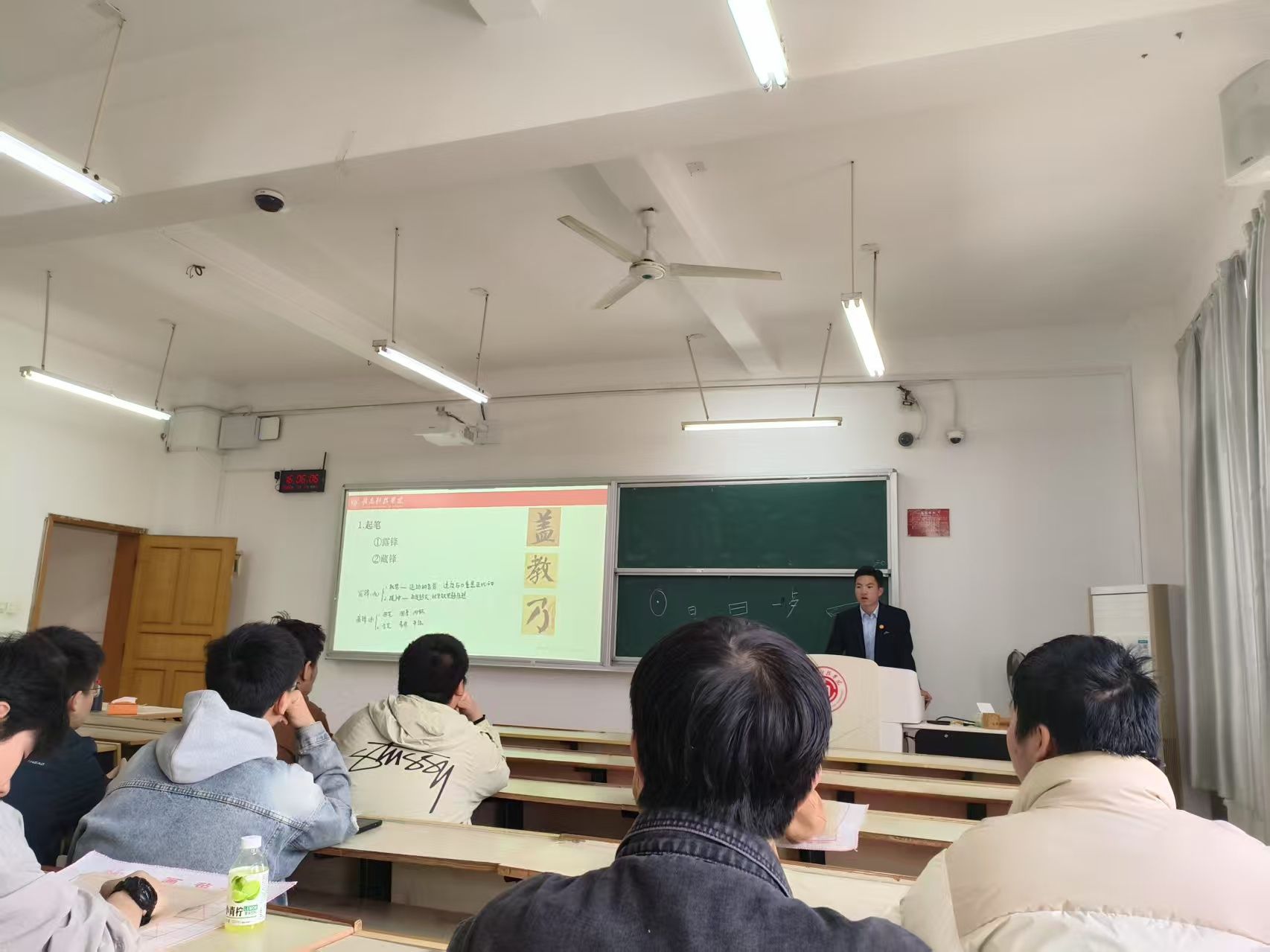 活动中,书法社团指导教师宋利林以汉字书法发展史为脉络,简要介绍了篆、隶、楷、行等字体的演变过程,重点讲解了汉字结构规律、笔锋运用技巧及基础控笔方法,并通过现场示范指导学生掌握书写要领。在实践环节,学生们以经典碑帖为范本进行临摹,从握笔姿势到笔画书写,沉浸体验书法艺术,感受传统文化与工科严谨精神的深度融合。