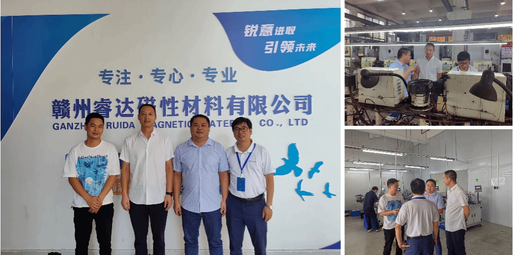 系主任刘辉一行率先走访赣州睿达磁性材料有限公司,在车间先后参观高剩磁、高矫顽力牌号的烧结钕铁硼磁体的生产工艺、质检工艺。随后就钕铁硼磁体的生产工艺、应用与公司销售总经理谢桂生等人相互交流。