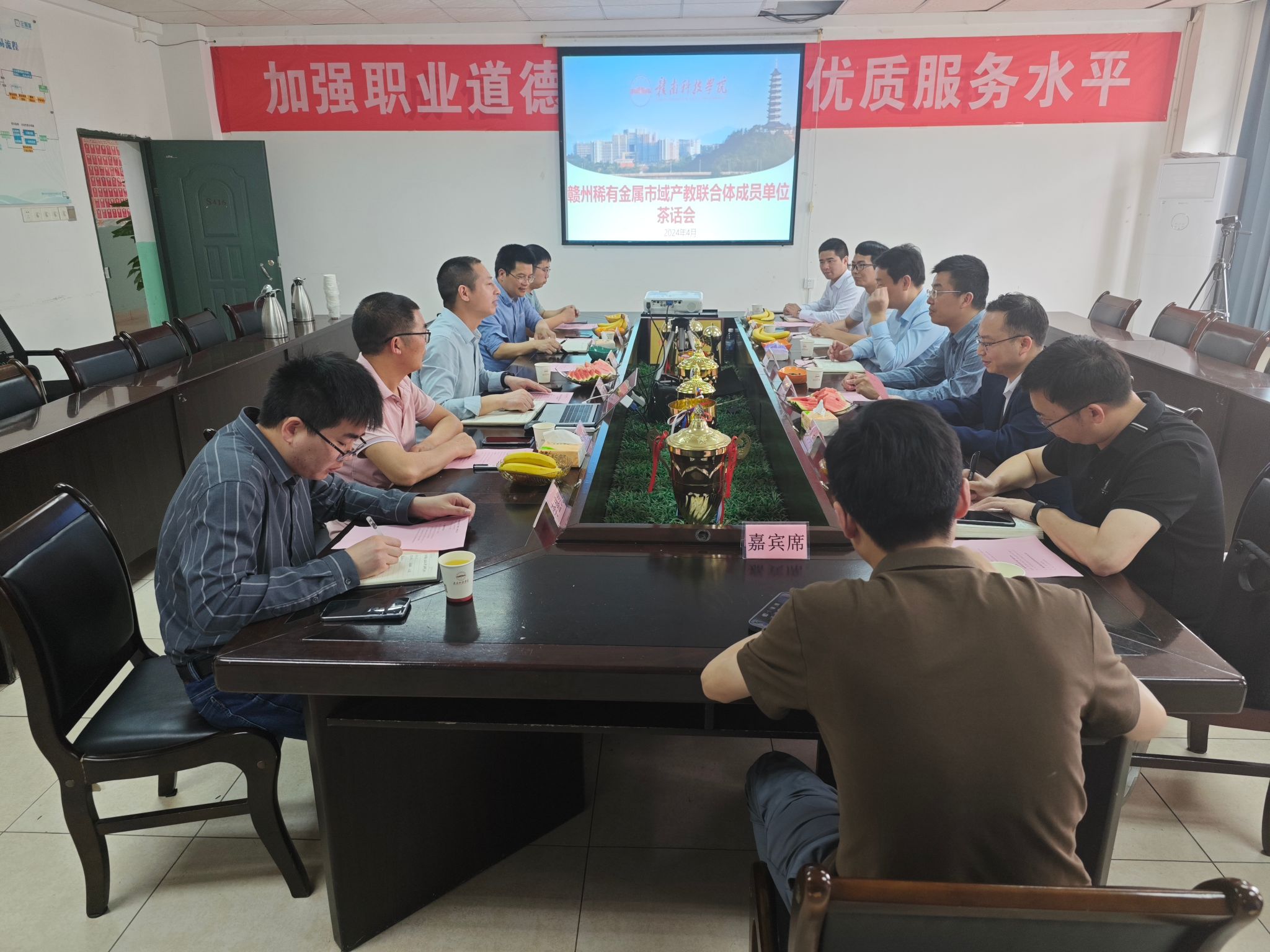 本网讯:4月3日上午,赣州稀有金属市域产教联合体成员单位茶话会在点点官网taptap点点体育S416会议室举行。赣州稀有金属市域产教联合体理事会理事长翁毅军、秘书长方竞,赣州腾远钴业研发部经理成方、人力资源经理刘斌,耀能新能源人力资源部经理吴荣华、电芯总工程师李小兵,点点官网智造学院负责人、教师代表参加茶话会。茶话会由刘辉主持。