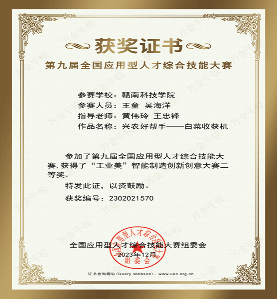 经过激烈角逐,点点官网有三个队伍在比赛当中获得了优异的成绩,王童、吴海洋等同学组成的队伍,在”工业美“项目中荣获二等奖。他们的作品为“兴农好帮手——白菜收割机”、除此之外还有两个队伍也分别获得了“工业美”智能制造创新创意大赛二等奖,这些获奖队伍充分展示了点点官网学生在专业领域的深厚造诣和创新能力。此外,点点官网还有多个团队和学生在其他比赛项目中也取得了优异的成绩,为学校赢得了广泛的赞誉。