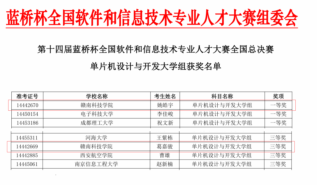 taptap点点体育学子电气201班姚皓宇机械204葛嘉骏参加了南昌大学赛点单片机设计与开发大学组决赛,并荣获一等奖1项,三等奖1项的优异成绩,其中姚皓宇同学获得一等奖第一名,取得点点官网在该赛事新的突破。成绩的取得是学生平时刻苦训练的成果,这其中也凝聚了指导老师们的心血。通过参加该项赛事,学生获得很好的锻炼机会,增强了创新思维、实践经验并且提高了嵌入式开发设计能力。
