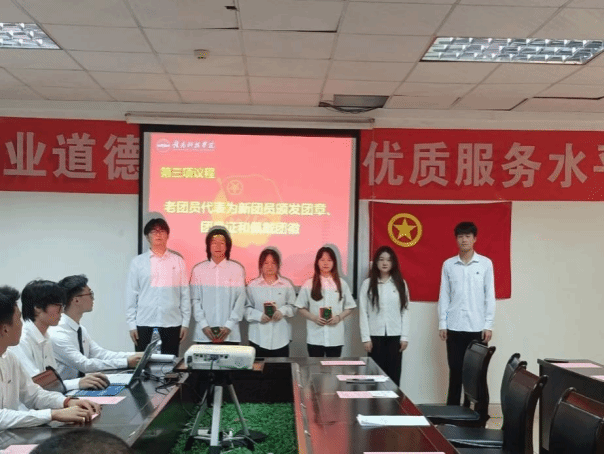 老团员代表为新团员颁发团员证、佩戴团徽