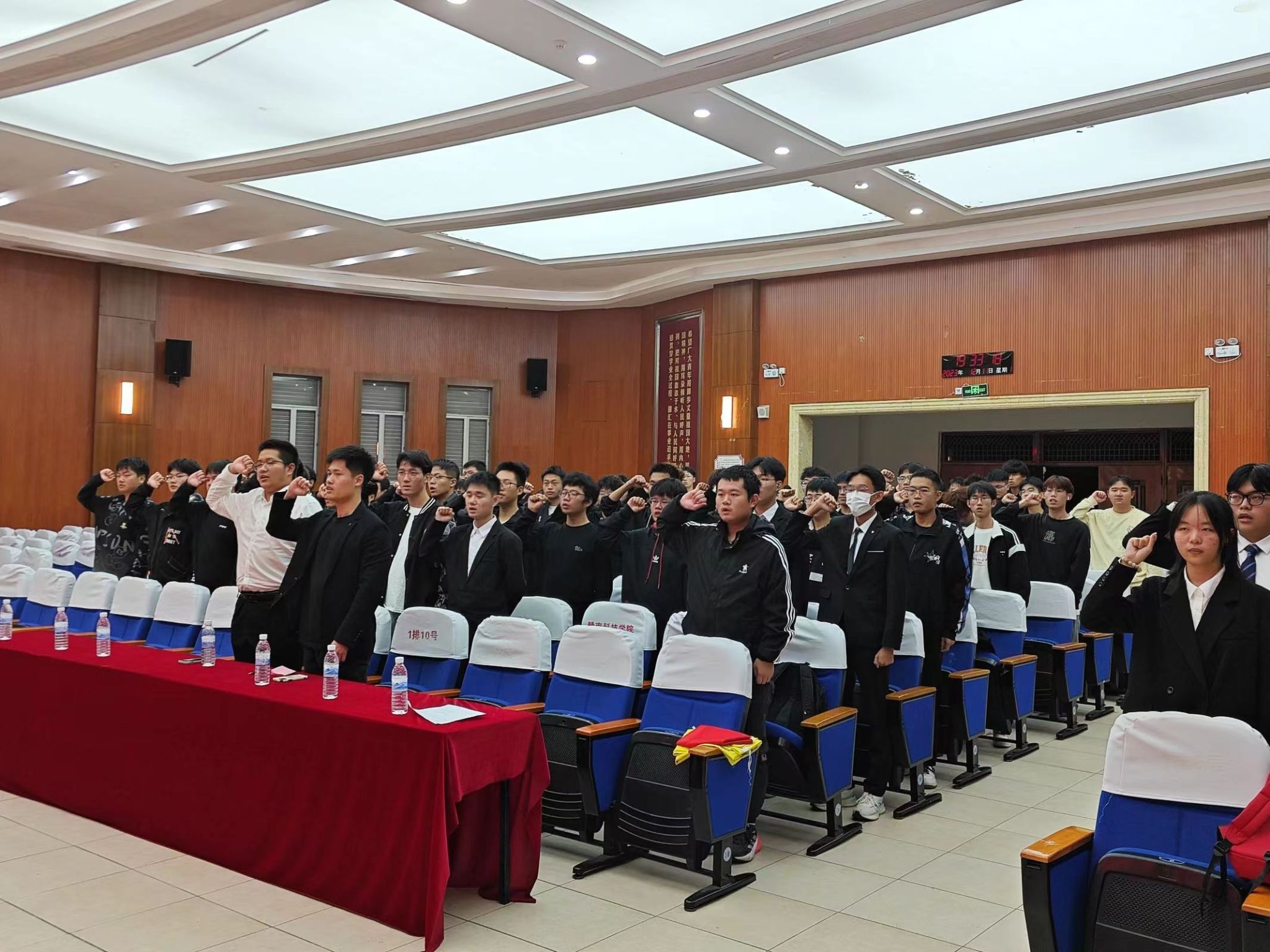 会议第一项议程,全体人员起立,庄严奏唱中国共产主义青年团团歌。会议第二项议程,团总支书记卢名亮为第十一期学员代表颁发结业证书,为第十一期优秀学员颁发荣誉证书以及为第十一期班助代表颁发聘书。